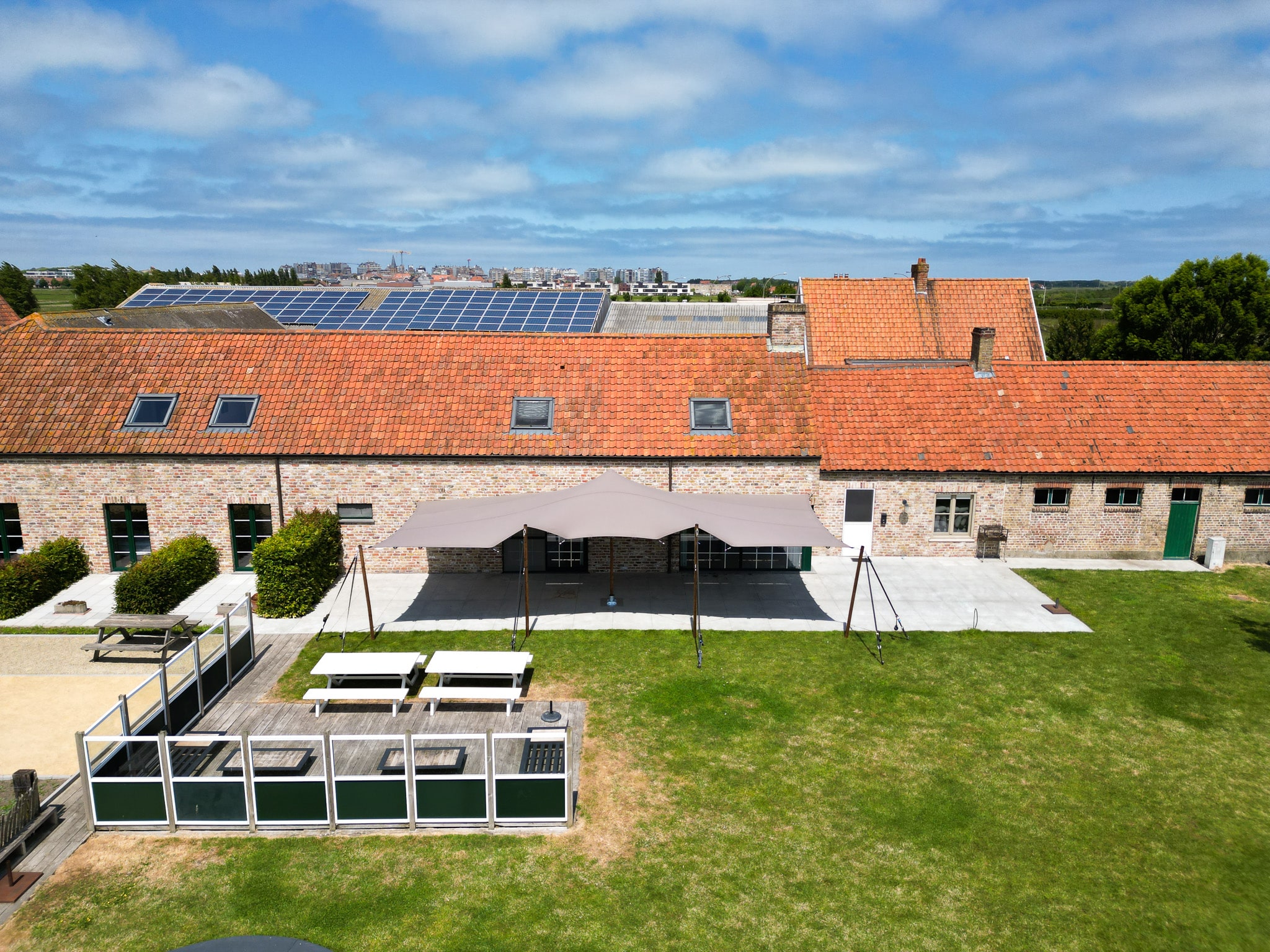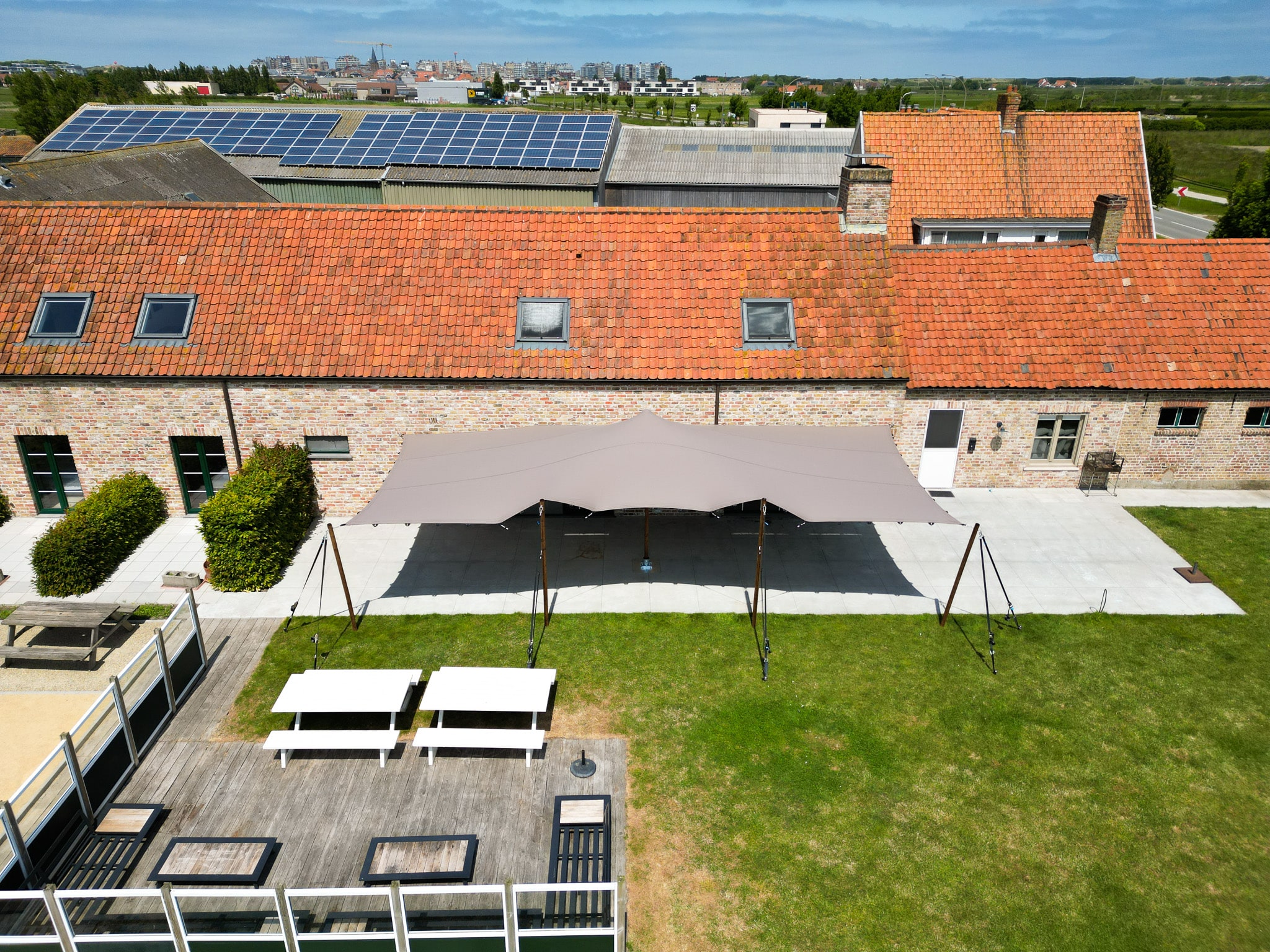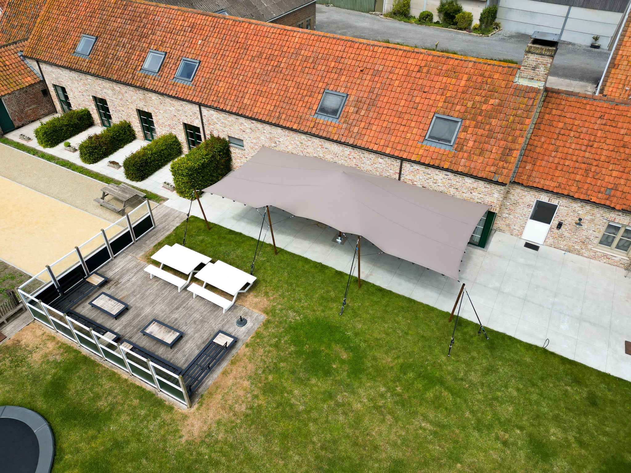 De tent biedt een beschutte en sfeervolle ruimte waar gasten kunnen ontspannen of samenkomen, ongeacht het weer. Dankzij de natuurlijke kleur en het elegante ontwerp past de overkapping naadloos bij de authentieke uitstraling van de hoeve.