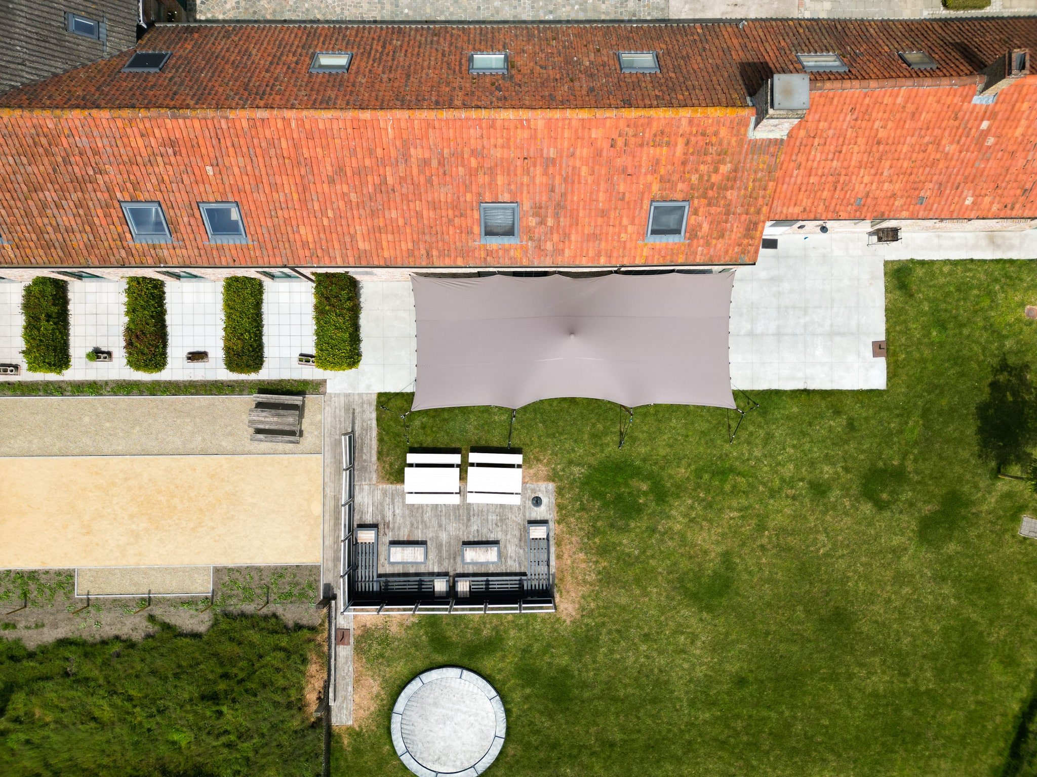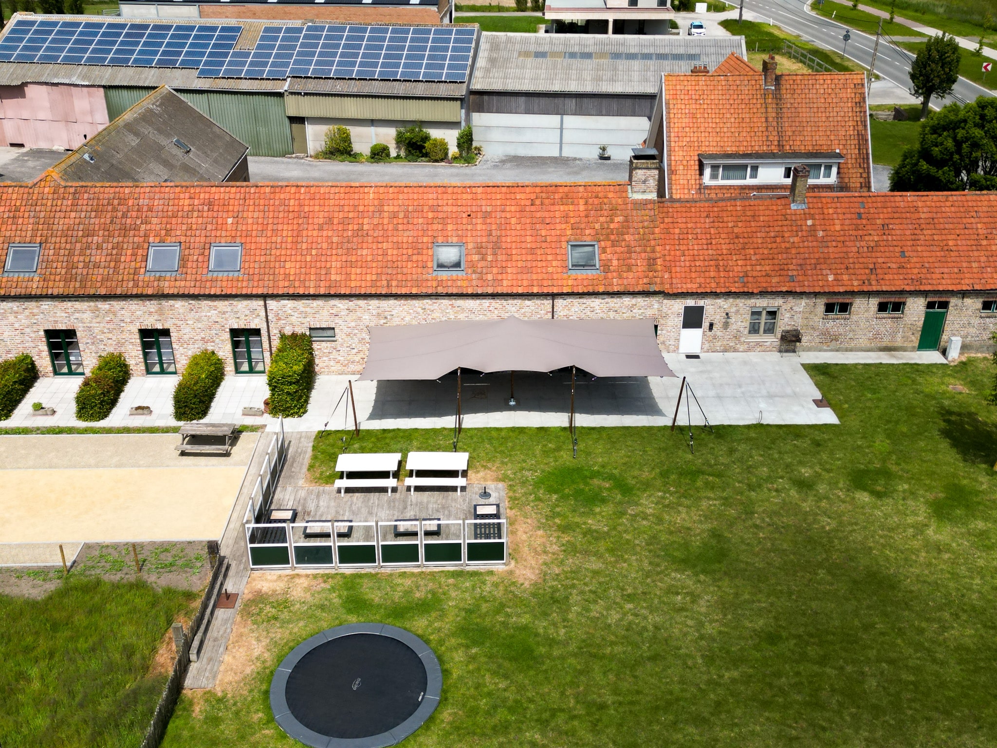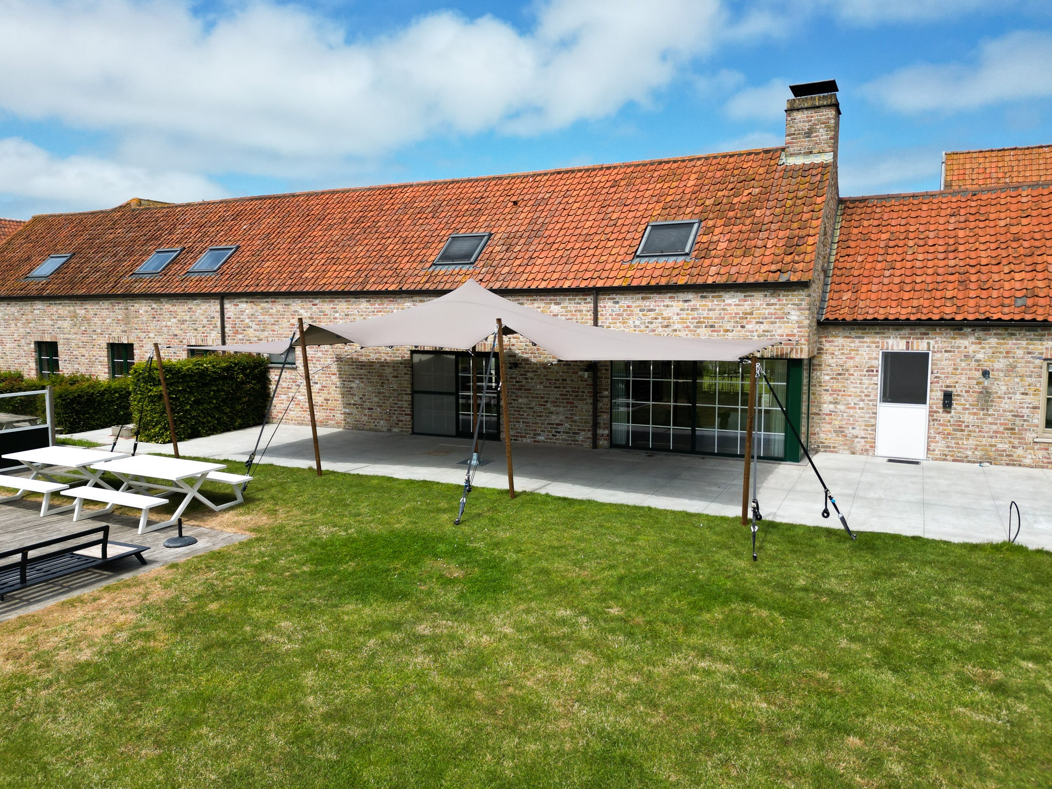 De tent biedt een beschutte en sfeervolle ruimte waar gasten kunnen ontspannen of samenkomen, ongeacht het weer. Dankzij de natuurlijke kleur en het elegante ontwerp past de overkapping naadloos bij de authentieke uitstraling van de hoeve.
