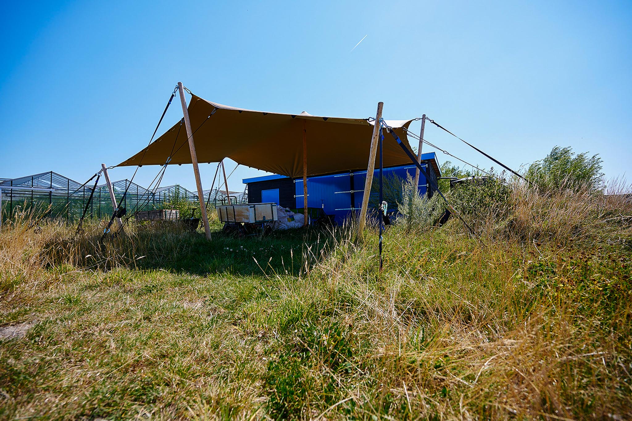 Bij Zeisles in Hellevoetsluis zijn drie zandkleurige stretchtenten geplaatst om extra horecaruimte bij de kas te creëren.